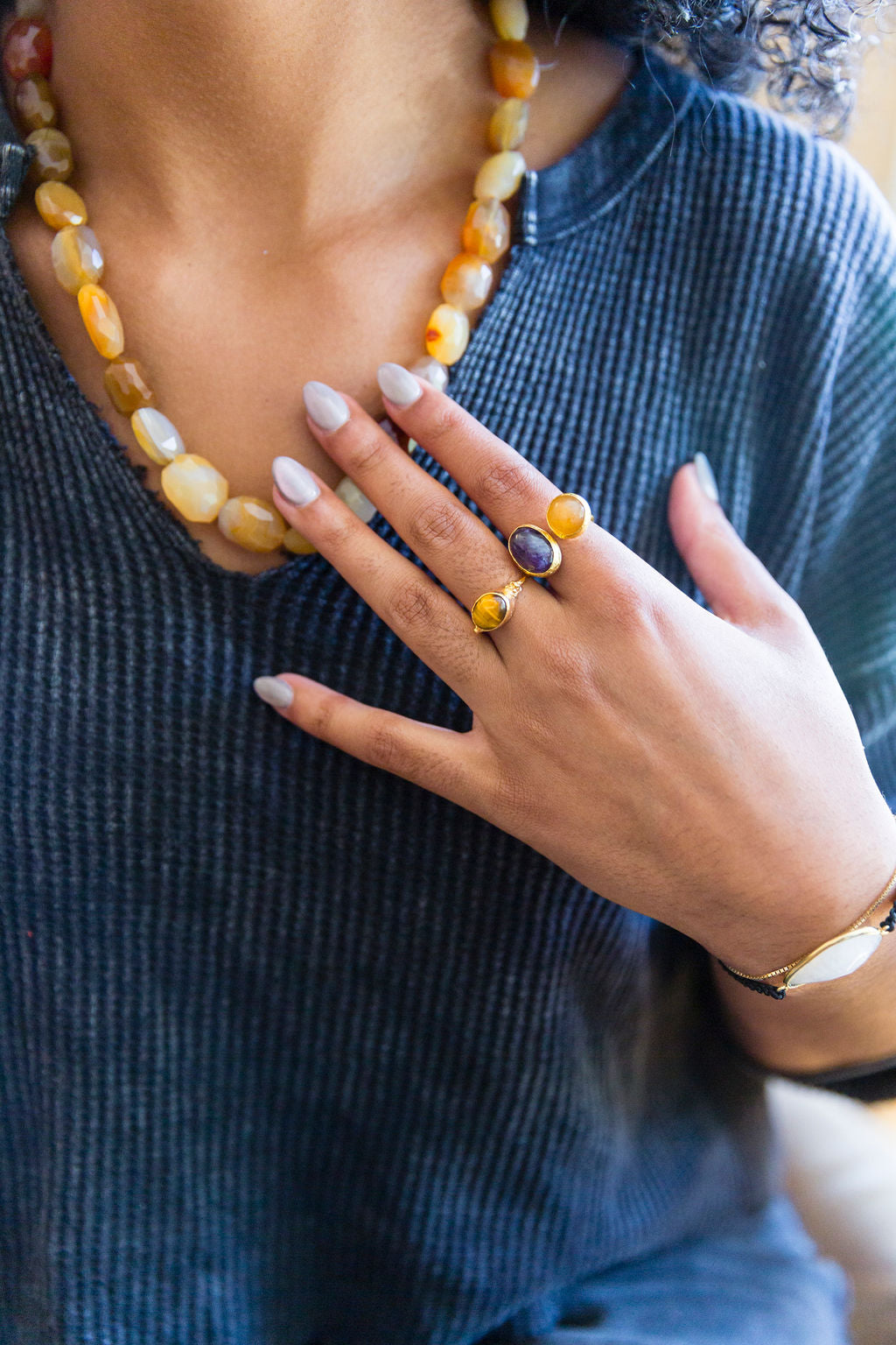The rich, earthy tones of the red agate stones beautifully contrast with the luxurious glow of 14k gold-filled accents, creating a piece that’s both striking and sophisticated.